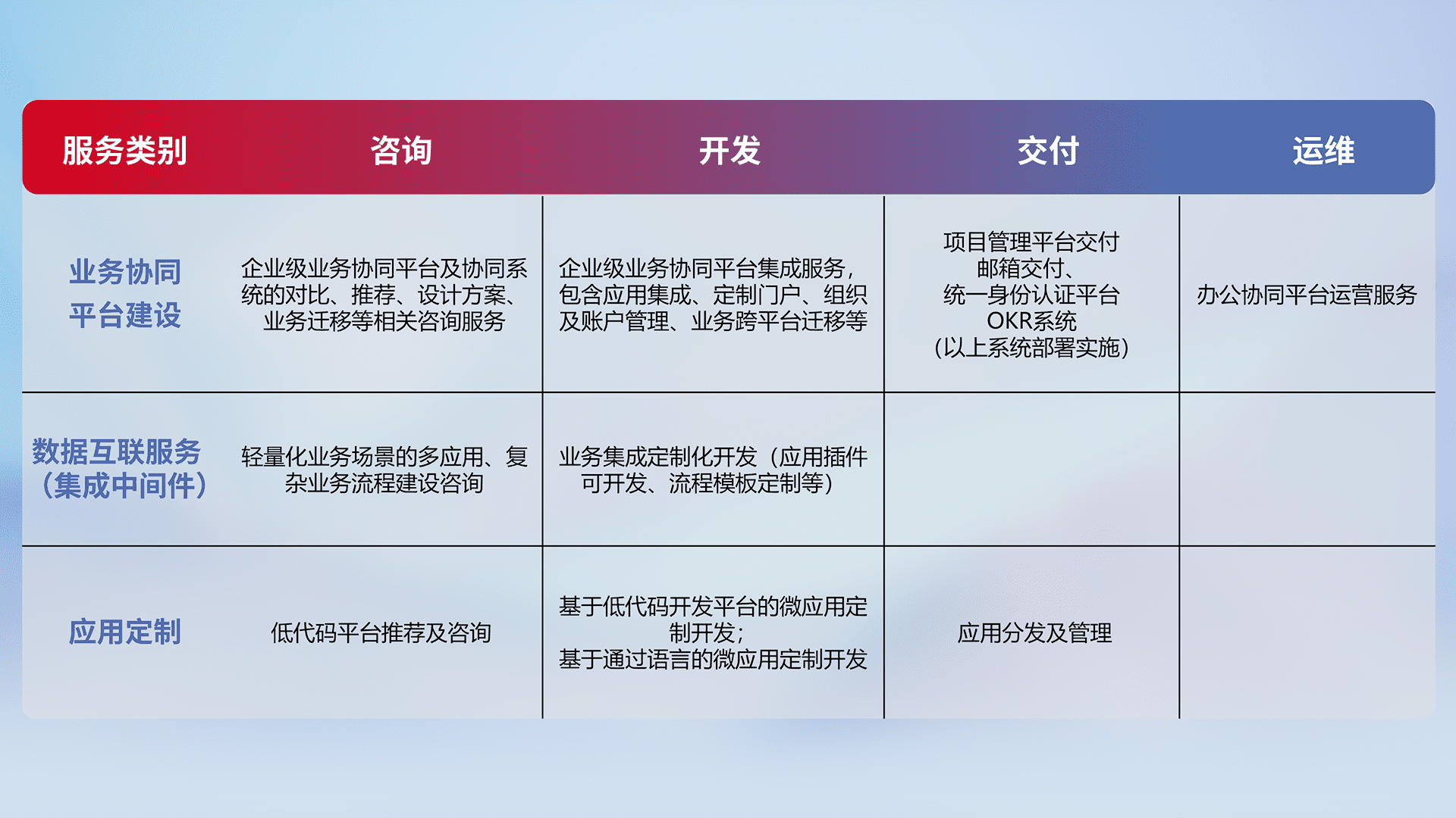 针对钉钉、、企微、、、IDaas等平台级产品提供产品的规划、、方案、、、、交付、、、、定制化开发等服务,,,,实现如统一协同办公、、、、智能客户服务、、、、混合会议管理、、、、智能数据查询、、等业务场景,,实现数字化转型。。。